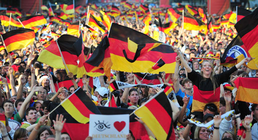 Supporters of the German national football team cheer with national flags during the public viewing at the "Fanmeile" (fan zone) in front of Berlin's landmark the Siegessaeule (Victory Column) on June 23, 2010 in Berlin. -Photo by AFP