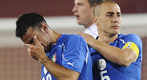 Italy's defender Fabio Cannavaro (R) consoles Italy's striker Fabio Quagliarella after the Group F first round 2010 World Cup football match Italy versus Slovakia. -Photo by AFP