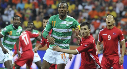 Ivory Coast's striker Didier Drogba (C) and North Korea's defender Ji Yun-Nam (R) watch the ball during their match. - AFP Photo