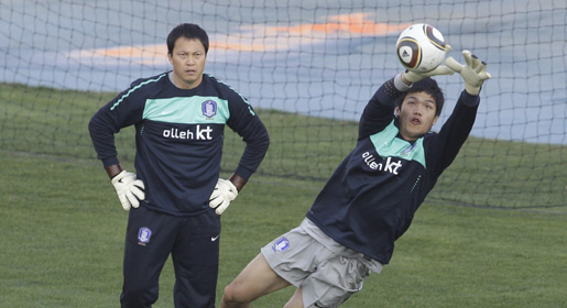 South Korea goal keeper Jung Sung-ryong, right, tries to catch a ball as goal keeper Lee Woon-jae looks on during a team training session for their second round of the World Cup soccer match against Uruguay. - AP Photo