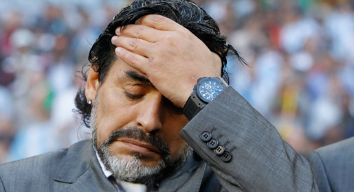Argentina's head coach Diego Maradona holds his head prior to the World Cup quarterfinal soccer match between Argentina and Germany in the Green Point Stadium in Cape Town, South Africa. -Photo by AP