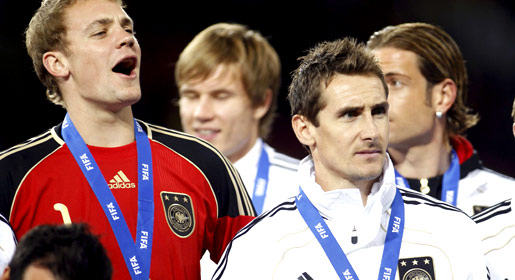 Germany's Miroslav Klose celebrates with Germany's goalkeeper Hans-Joerg Butt after their 2010 World Cup third place playoff soccer match against Uruguay in Port Elizabeth July 10. -Photo by Reuters