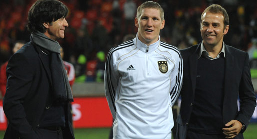 Germany's midfielder Bastian Schweinsteiger (C) and Germany's coach Joachim Loew (L) celebrate with Germany's assistant manager Hans-Dieter Flick (R) after Germany won the third place World Cup 2010 football match against Uruguay on July 10. -Photo by AFP