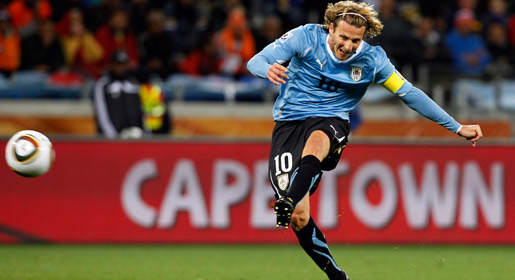 Forlan smashed home a superb long-range strike to bring Uruguay level at 1-1 in their World Cup semi-final against Netherlands. -Photo by AFP